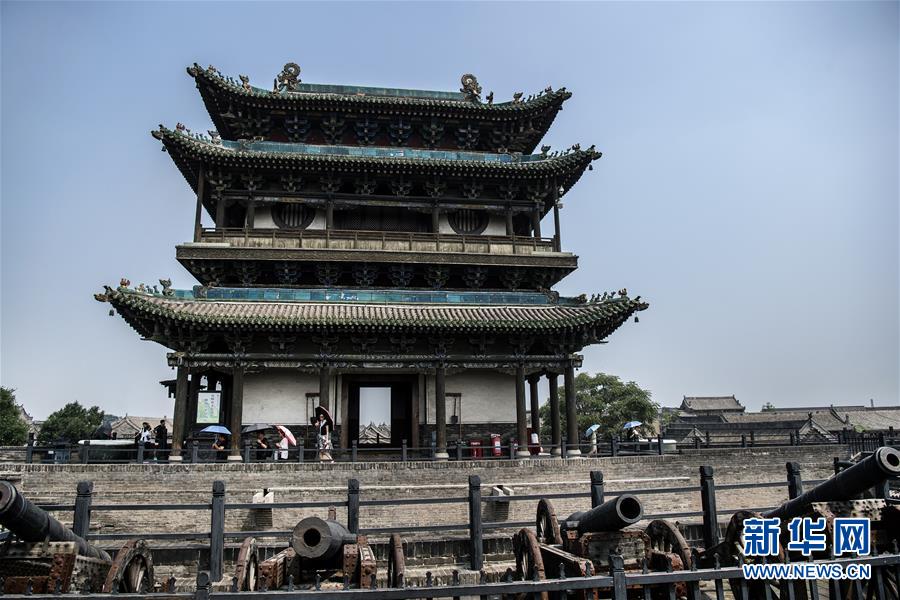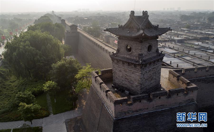 這是7月20日無人機拍攝的平遙古城墻與護城河。平遙古城城墻總周長6163米,墻高約12米,把面積約2.25平方公里的平遙縣城隔為兩個風格迥異的世界。城墻以內(nèi)街道、鋪面、市樓保留明清形制,城墻以外為新城。