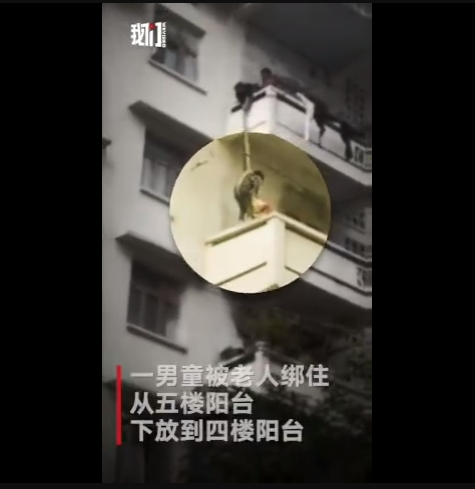 一只貓跑到了百順街老百貨公司宿舍樓三樓的窗戶遮雨臺(tái)上,被5樓的老太太發(fā)現(xiàn),老太太善心發(fā)作,竟將孫子用繩子吊起,從5樓慢慢放至3樓救貓,整個(gè)過(guò)程不禁令人捏汗。