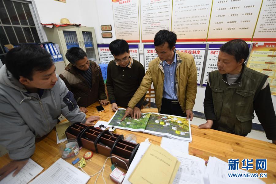 八好村駐村第一書(shū)記韋德王(左二)和同事在辦公樓里討論工作(2019年11月12日攝)。新華社記者黃孝邦攝