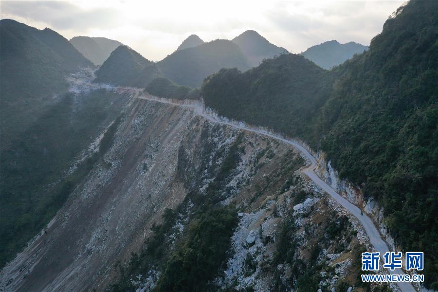 八好村駐村第一書記韋德王徒步前往弄麻屯開展扶貧工作,弄麻屯的公路尚在建設(shè)當(dāng)中(2019年12月16日攝)。新華社記者黃孝邦攝
