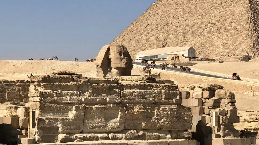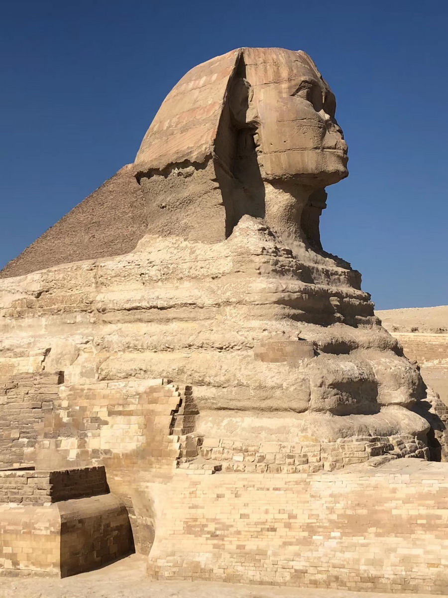此像高20米,長57米,算上兩個(gè)前爪,全長72米。它頭戴“奈姆斯”皇冠,兩耳側(cè)有扇狀的“那姆斯”頭巾下垂,前額上刻著圣蛇浮雕,下頜有帝王的標(biāo)志,下垂的長須,脖子上圍著項(xiàng)圈,鷹的羽毛圖案打扮著獅身。孫衛(wèi)南攝