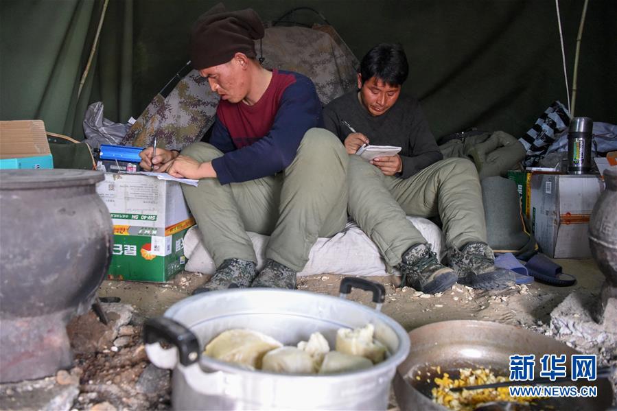 1月14日,查線工在吃飯間隙收聽電臺(tái)里報(bào)出的不正常道樁號(hào),并記錄在本子上。地球物理勘探是油氣開發(fā)的第一步,相當(dāng)于給地球做CT。物探工人按照嚴(yán)格的測(cè)線部署,在相應(yīng)位置鉆井,然后實(shí)施地震,采集地震波數(shù)據(jù)??蒲腥藛T通過數(shù)據(jù)組成的“CT片”,就能夠清晰地“看”到地下的地質(zhì)結(jié)構(gòu),判斷哪里埋藏有石油或者天然氣。2019年10月,東方地球物理勘探有限責(zé)任公司塔里木物探處2113隊(duì)進(jìn)入新疆塔克拉瑪干沙漠腹地,開始中古14-21、塔中2兩個(gè)區(qū)塊的三維地震勘探。近2000名物探工人將在1000平方公里的范圍內(nèi)一直工作到2020年4月,這也意味著他們將在塔克拉瑪干沙漠腹地連續(xù)度過第14個(gè)除夕夜。蘊(yùn)藏著豐富石油天然氣資源的新疆塔克拉瑪干沙漠有“死亡之?!敝Q,氣候干燥,年降水量在50毫米以下,冬季地表最低溫度超過零下30攝氏度,是世界油氣勘探難度最大的地區(qū)之一。為避開風(fēng)季,物探工人每年9、10月份進(jìn)入沙漠,一直工作到來年4月,夜以繼日與黃沙、嚴(yán)寒為伴,用辛勤的汗水,為祖國(guó)找油找氣。新華社記者丁磊攝