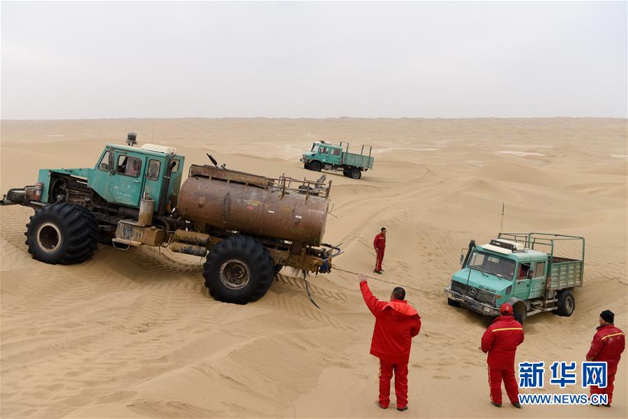 一輛測量作業(yè)車陷在沙坑中,水罐車進行營救(1月13日攝)。地球物理勘探是油氣開發(fā)的第一步,相當于給地球做CT。物探工人按照嚴格的測線部署,在相應(yīng)位置鉆井,然后實施地震,采集地震波數(shù)據(jù)??蒲腥藛T通過數(shù)據(jù)組成的“CT片”,就能夠清晰地“看”到地下的地質(zhì)結(jié)構(gòu),判斷哪里埋藏有石油或者天然氣。2019年10月,東方地球物理勘探有限責任公司塔里木物探處2113隊進入新疆塔克拉瑪干沙漠腹地,開始中古14-21、塔中2兩個區(qū)塊的三維地震勘探。近2000名物探工人將在1000平方公里的范圍內(nèi)一直工作到2020年4月,這也意味著他們將在塔克拉瑪干沙漠腹地連續(xù)度過第14個除夕夜。蘊藏著豐富石油天然氣資源的新疆塔克拉瑪干沙漠有“死亡之?!敝Q,氣候干燥,年降水量在50毫米以下,冬季地表最低溫度超過零下30攝氏度,是世界油氣勘探難度最大的地區(qū)之一。為避開風季,物探工人每年9、10月份進入沙漠,一直工作到來年4月,夜以繼日與黃沙、嚴寒為伴,用辛勤的汗水,為祖國找油找氣。新華社記者丁磊攝