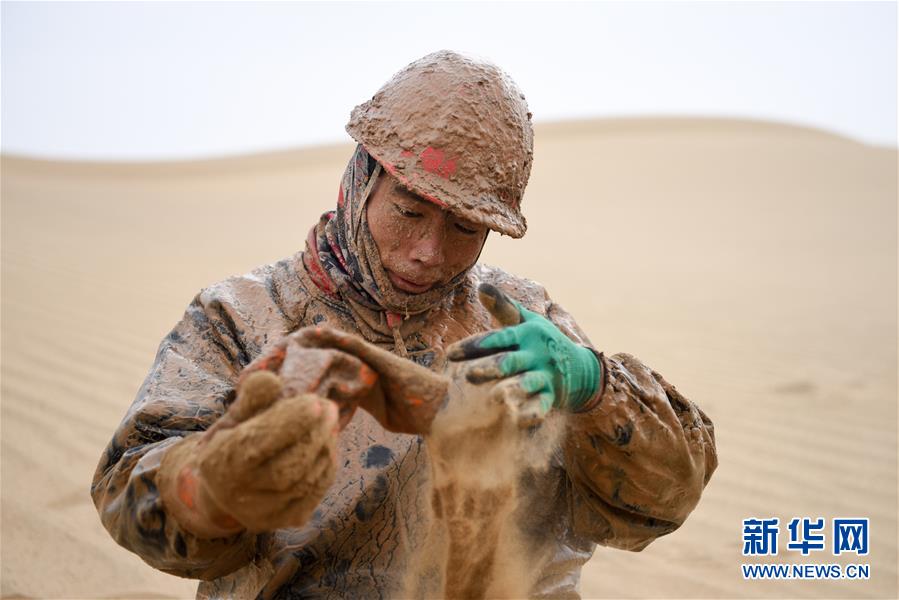 1月13日,鉆井工潘洪星用沙子帶出手套里的泥水。地球物理勘探是油氣開發(fā)的第一步,相當(dāng)于給地球做CT。物探工人按照嚴(yán)格的測線部署,在相應(yīng)位置鉆井,然后實施地震,采集地震波數(shù)據(jù)??蒲腥藛T通過數(shù)據(jù)組成的“CT片”,就能夠清晰地“看”到地下的地質(zhì)結(jié)構(gòu),判斷哪里埋藏有石油或者天然氣。2019年10月,東方地球物理勘探有限責(zé)任公司塔里木物探處2113隊進(jìn)入新疆塔克拉瑪干沙漠腹地,開始中古14-21、塔中2兩個區(qū)塊的三維地震勘探。近2000名物探工人將在1000平方公里的范圍內(nèi)一直工作到2020年4月,這也意味著他們將在塔克拉瑪干沙漠腹地連續(xù)度過第14個除夕夜。蘊藏著豐富石油天然氣資源的新疆塔克拉瑪干沙漠有“死亡之?!敝Q,氣候干燥,年降水量在50毫米以下,冬季地表最低溫度超過零下30攝氏度,是世界油氣勘探難度最大的地區(qū)之一。為避開風(fēng)季,物探工人每年9、10月份進(jìn)入沙漠,一直工作到來年4月,夜以繼日與黃沙、嚴(yán)寒為伴,用辛勤的汗水,為祖國找油找氣。新華社記者丁磊攝