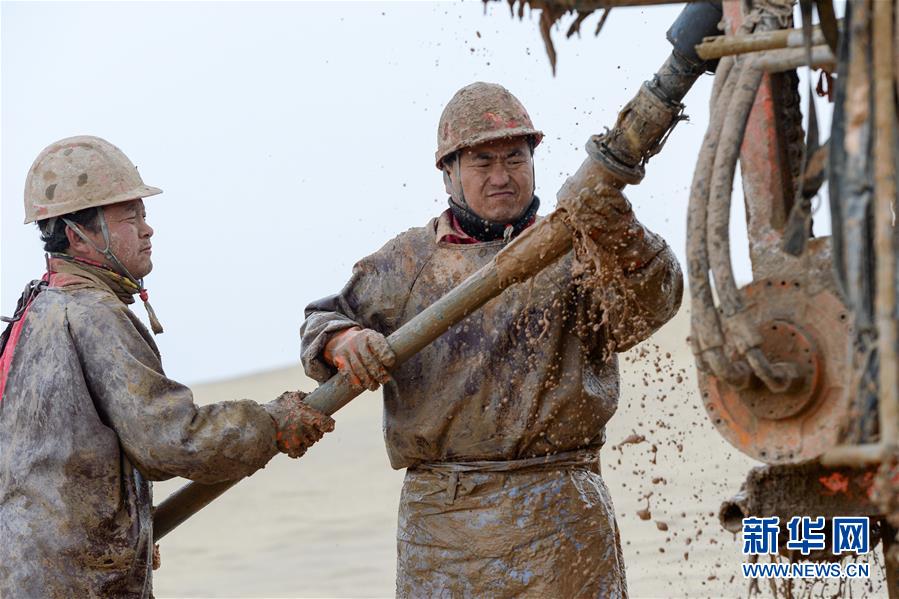 1月13日,鉆井工在連接鉆桿。地球物理勘探是油氣開(kāi)發(fā)的第一步,相當(dāng)于給地球做CT。物探工人按照嚴(yán)格的測(cè)線部署,在相應(yīng)位置鉆井,然后實(shí)施地震,采集地震波數(shù)據(jù)??蒲腥藛T通過(guò)數(shù)據(jù)組成的“CT片”,就能夠清晰地“看”到地下的地質(zhì)結(jié)構(gòu),判斷哪里埋藏有石油或者天然氣。2019年10月,東方地球物理勘探有限責(zé)任公司塔里木物探處2113隊(duì)進(jìn)入新疆塔克拉瑪干沙漠腹地,開(kāi)始中古14-21、塔中2兩個(gè)區(qū)塊的三維地震勘探。近2000名物探工人將在1000平方公里的范圍內(nèi)一直工作到2020年4月,這也意味著他們將在塔克拉瑪干沙漠腹地連續(xù)度過(guò)第14個(gè)除夕夜。蘊(yùn)藏著豐富石油天然氣資源的新疆塔克拉瑪干沙漠有“死亡之?!敝Q,氣候干燥,年降水量在50毫米以下,冬季地表最低溫度超過(guò)零下30攝氏度,是世界油氣勘探難度最大的地區(qū)之一。為避開(kāi)風(fēng)季,物探工人每年9、10月份進(jìn)入沙漠,一直工作到來(lái)年4月,夜以繼日與黃沙、嚴(yán)寒為伴,用辛勤的汗水,為祖國(guó)找油找氣。新華社記者丁磊攝