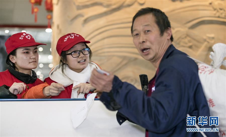1月14日,西安北站客運員吉如(右一)在引導(dǎo)旅客。路再遠、再艱辛,也擋不住回家的腳步。在西安北站的每一個角落,處處充滿溫情和歸鄉(xiāng)的盼望。連日來,西安北站日均發(fā)送旅客12.1萬人次,一列列春運的列車,載著中國人的鄉(xiāng)愁,駛向遠方。新華社記者陶明攝