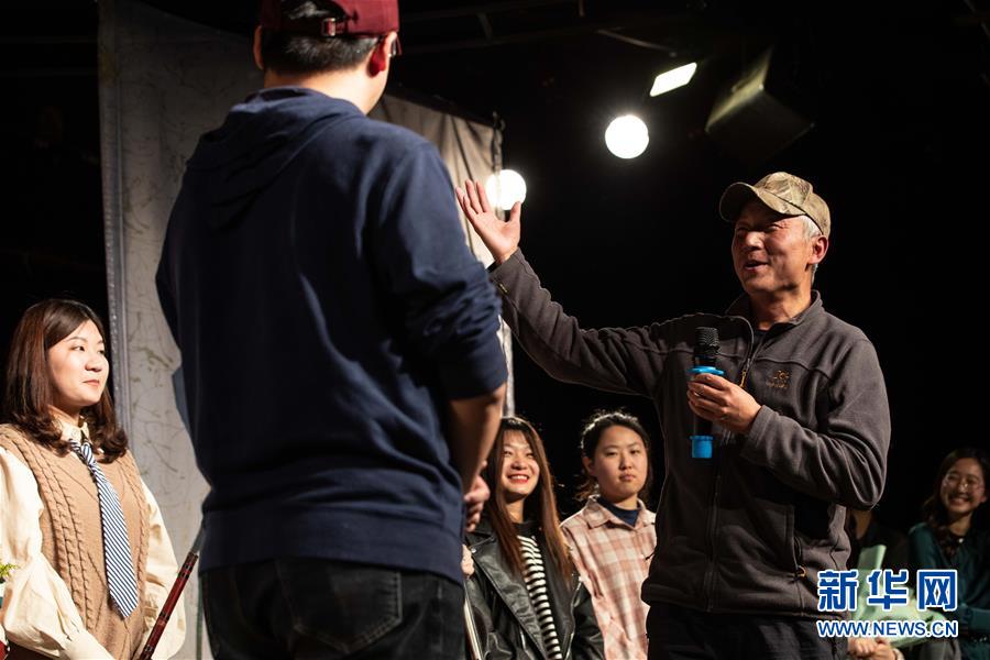 1月14日,中國(guó)著名野生動(dòng)物攝影師奚志農(nóng)(右一)在演出結(jié)束后向演員致謝。新華社記者 吳壯 攝