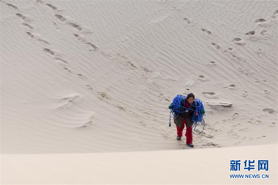 查線(xiàn)工周福香扛著采集電纜翻越沙山(1月15日攝)。 新華社記者 丁磊 攝
