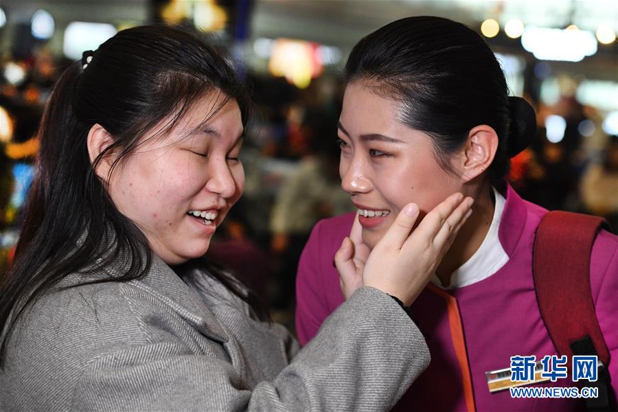 盲人姑娘吳瀟(左)從西安北站中轉(zhuǎn)回延安老家,得到吉如的溫馨服務(wù)。臨別時(shí),吳瀟激動地說:“小姐姐,你的服務(wù)太貼心了,我看不見你,能摸摸你的臉頰嗎?”(1月15日攝)。 新華社記者 陶明 攝
