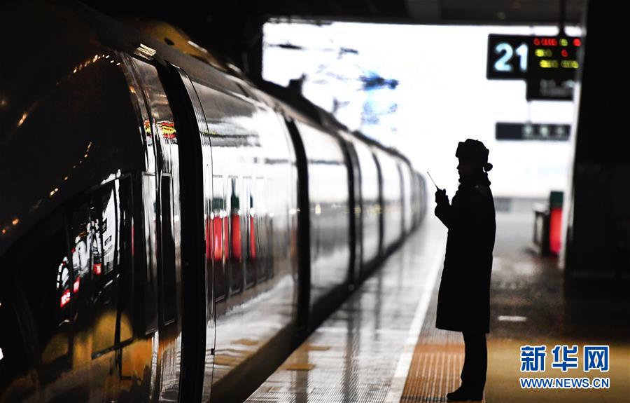 吉如在西安北站站臺上,與檢票口客運(yùn)人員聯(lián)控(1月14日攝)。今年春運(yùn)列車開行密度大,站臺崗位人員緊張,吉如時(shí)常被調(diào)到站臺進(jìn)行站臺服務(wù)工作。 新華社記者 陶明 攝