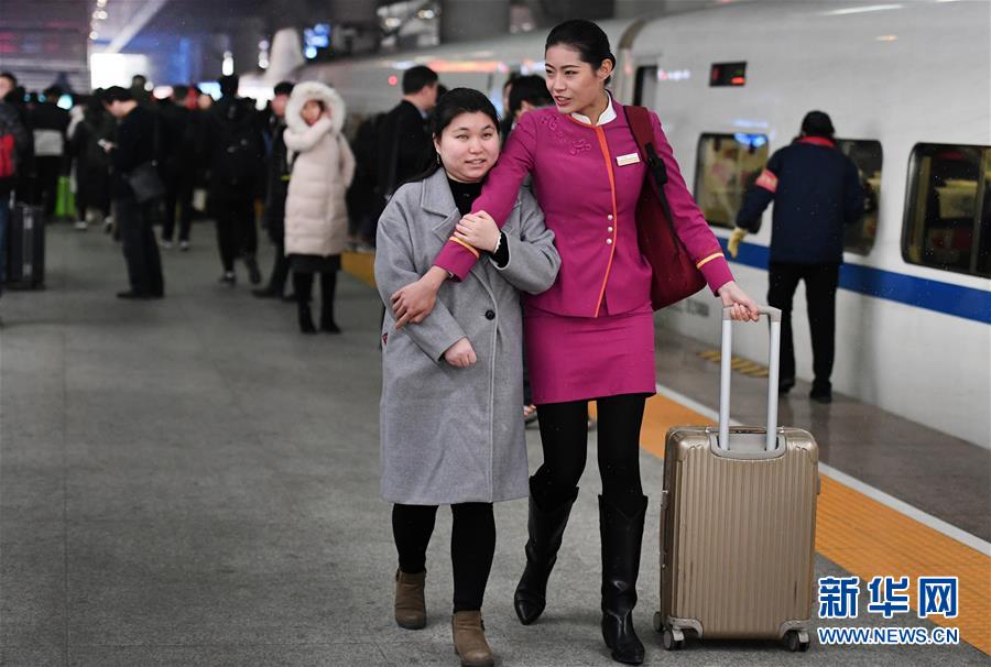吉如(前右)護送盲人姑娘吳瀟上車(1月15日攝)。 新華社記者 陶明 攝