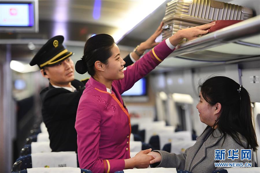 吉如(中)將盲人姑娘吳瀟護(hù)送上車后,為她安放行李(1月15日攝)。 新華社記者 陶明 攝