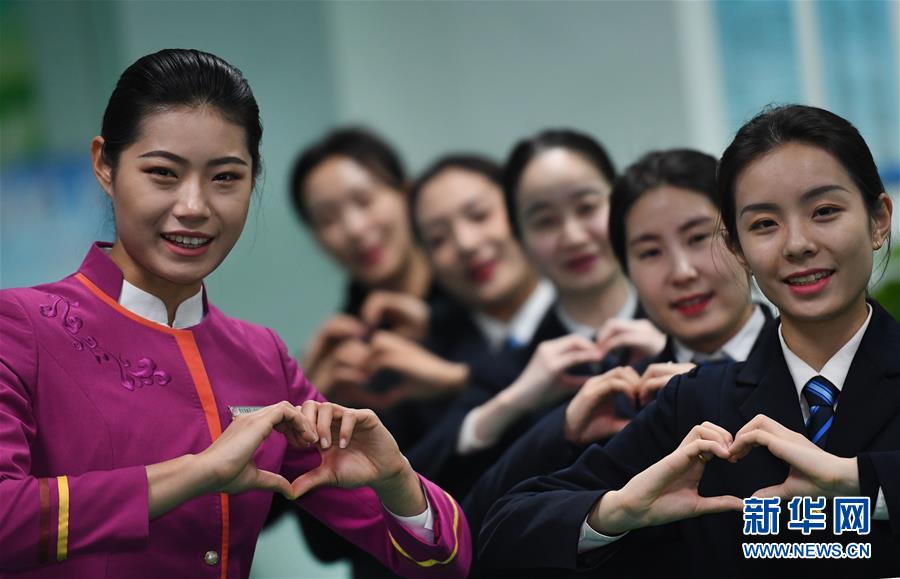 吉如(左一)在車站職工活動室里指導(dǎo)同事禮儀訓(xùn)練(1月15日攝)。 新華社記者 陶明 攝