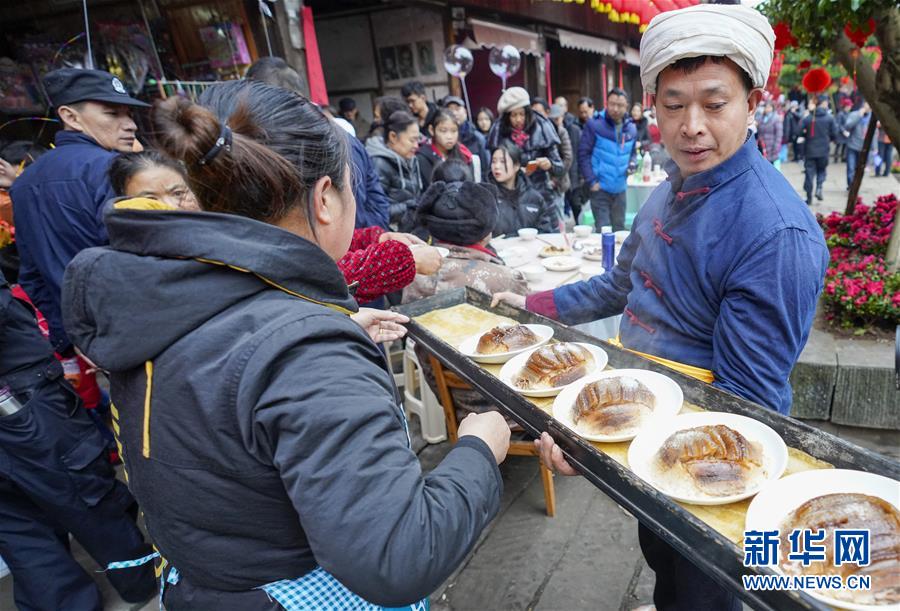 1月18日,在中山古鎮(zhèn)的“千米長(zhǎng)宴”上,民間藝人用古鎮(zhèn)傳統(tǒng)“打盆”絕藝給游客們上菜。當(dāng)日中午,伴隨著一聲“開(kāi)席嘍”,一年一度的“千米長(zhǎng)宴”在重慶市江津區(qū)中山古鎮(zhèn)舉行。噴香的煙熏豆腐、軟糯的夾燒肉、可口的石板糍粑……800余桌年味十足的特色美食,吸引了兩萬(wàn)多名游客前來(lái)體驗(yàn)傳統(tǒng)民俗,感受“一雙筷子吃遍一條街”的暢快淋漓。中山古鎮(zhèn)自古就有“千米匯長(zhǎng)宴萬(wàn)人祈福祉”的習(xí)俗。每年春節(jié)期間,古鎮(zhèn)老街居民都會(huì)在千米長(zhǎng)街上大擺“百家宴”,祝福生意興隆、家業(yè)興旺、風(fēng)調(diào)雨順、五谷豐登。新華社記者劉潺攝