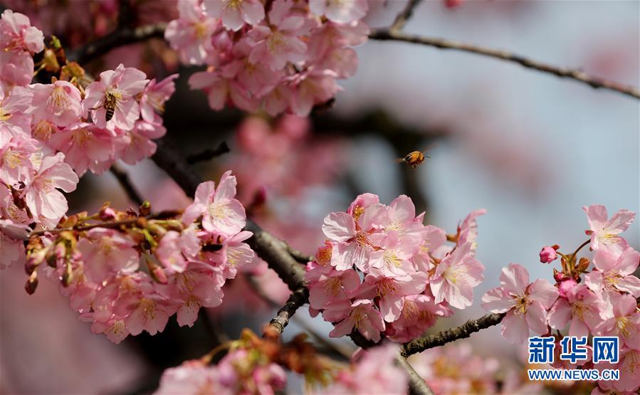 2月24日,蜜蜂在上海松江辰山植物園內(nèi)盛開的河津櫻櫻花叢中飛舞。近日,上海松江區(qū)辰山植物園內(nèi)的河津櫻絢麗綻放,花團(tuán)錦簇間一派盎然春意。 新華社記者 方喆 攝