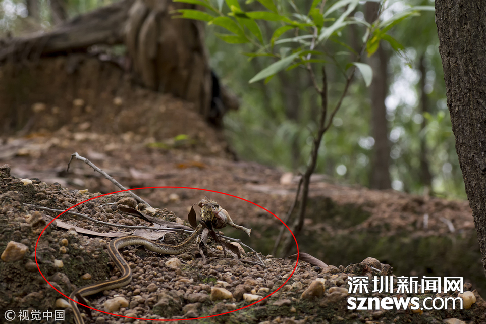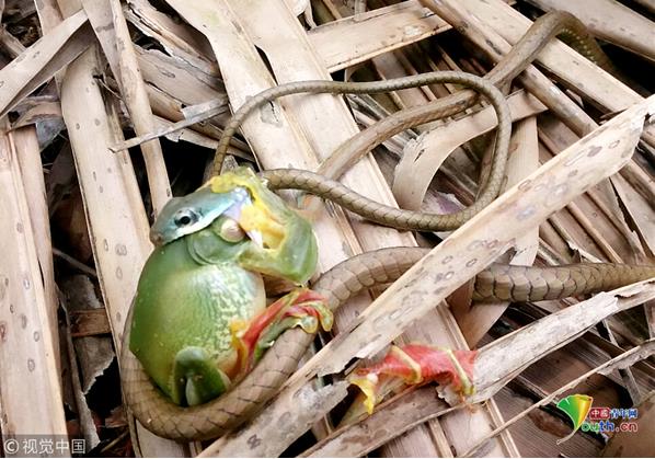 印度喀拉拉邦,一條大眼樹(shù)蛇非常貪婪地一口吞下了一只長(zhǎng)約10厘米的青蛙,只剩青蛙兩只腿在外掙扎。28歲的捕蛇人Sujith VP拍下這一過(guò)程。