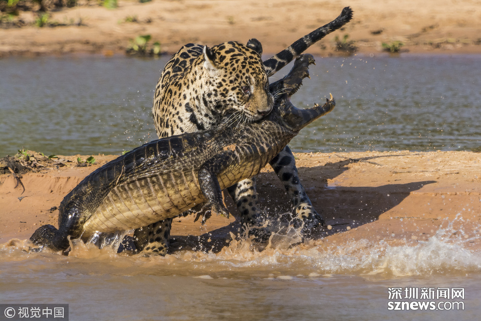 當(dāng)?shù)貢r(shí)間2013年8月25日,巴西潘特納爾,一頭雄性美洲豹攻擊了一條巴拉圭凱門鱷并與之纏斗。這只美洲豹預(yù)先躲在水中匍匐前進(jìn),然后突然出現(xiàn)把這只鱷魚震住,隨后用牙刺進(jìn)鱷魚的堅(jiān)硬的外殼中,將其拖入?yún)擦帧?/p>