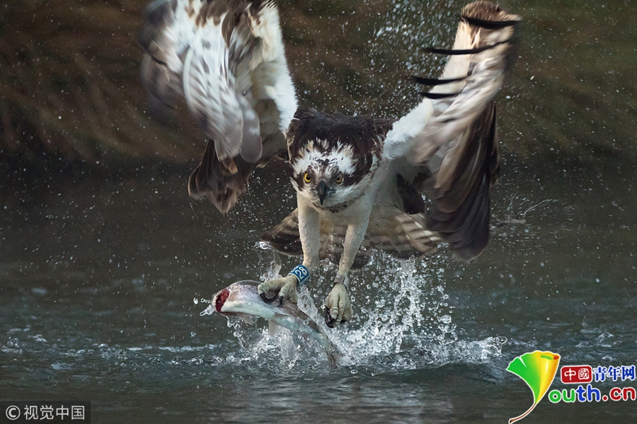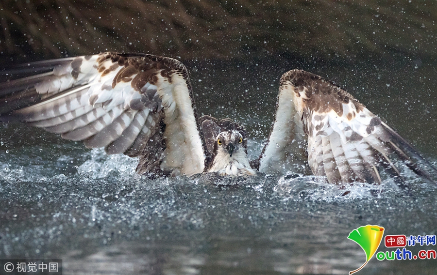 一只魚鷹潛入湖中捉鱒魚,激起巨大的水花。圖片作者/視覺(jué)中國(guó)