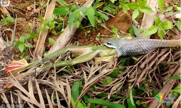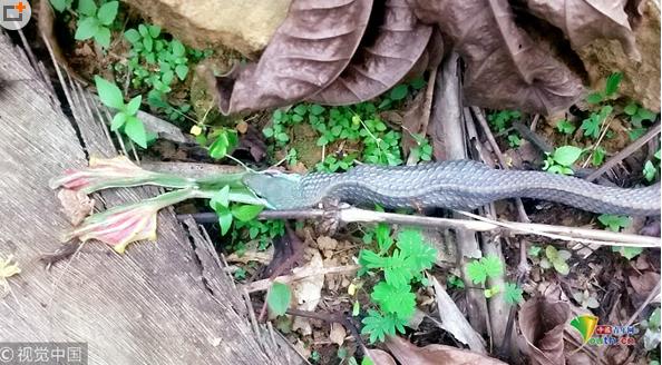 2018年7月18日,廣東東莞,藍綠鵲與蛇的地盤爭斗。