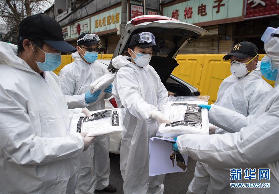 2月29日,W大武漢緊急救援隊隊長王紫懿(中)為隊員發(fā)放防護(hù)服。她說,現(xiàn)在防護(hù)物資十分緊缺,隊員們都在省著用,希望能撐到疫情結(jié)束。新華社記者 肖藝九 攝