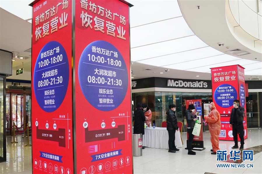 3月13日,在哈爾濱香坊萬達廣場內(nèi),工作人員在給進店顧客測體溫、消毒。 近日,哈爾濱市多家大型商場陸續(xù)恢復營業(yè)。這些恢復營業(yè)的商場采取多種措施,從嚴細致做好疫情防控和安全風險防范工作,為廣大顧客提供安全放心的購物空間。 新華社記者 王建威 攝