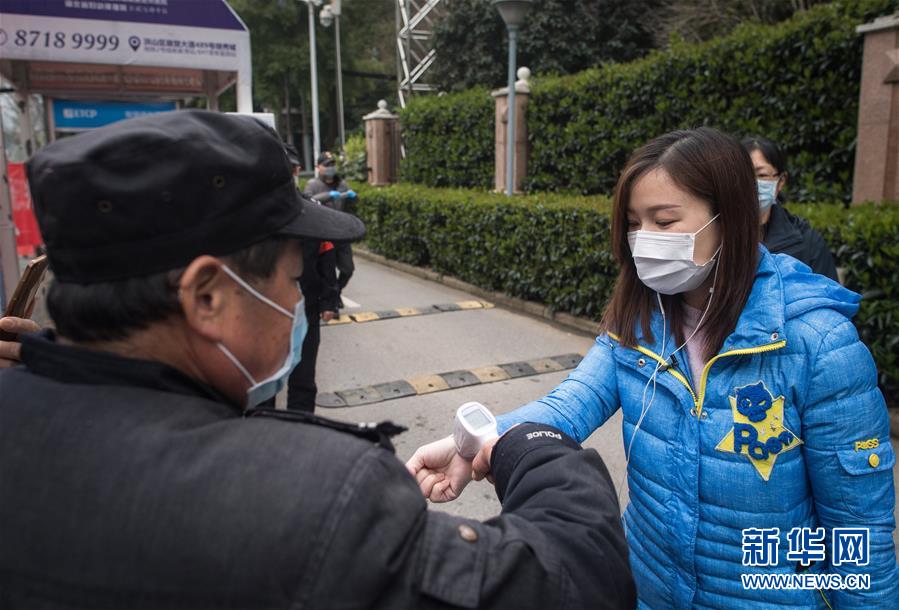 3月12日,小區(qū)安保人員對黎婧進行體溫檢測。 3月12日,插畫師黎婧和84位病友離開自己居住的武漢軟件工程職業(yè)學院康復驛站,回到自己家中。他們都是治愈出院的新冠病毒肺炎患者,已經(jīng)在武漢軟件工程職業(yè)學院康復驛站進行了14天醫(yī)學觀察,達到醫(yī)學標準,成功解除隔離。他們由專車運送至所屬社區(qū)附近的集散點后,在社區(qū)工作人員的陪同下回家。 新華社記者 肖藝九 攝