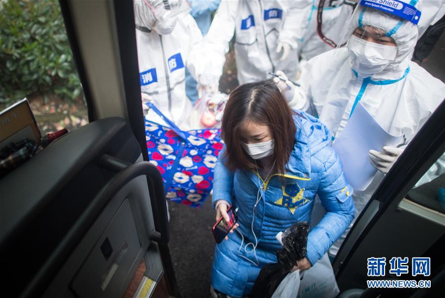 3月12日,黎婧(前)在志愿者的陪護(hù)下登上大巴。 3月12日,插畫師黎婧和84位病友離開自己居住的武漢軟件工程職業(yè)學(xué)院康復(fù)驛站,回到自己家中。他們都是治愈出院的新冠病毒肺炎患者,已經(jīng)在武漢軟件工程職業(yè)學(xué)院康復(fù)驛站進(jìn)行了14天醫(yī)學(xué)觀察,達(dá)到醫(yī)學(xué)標(biāo)準(zhǔn),成功解除隔離。他們由專車運(yùn)送至所屬社區(qū)附近的集散點(diǎn)后,在社區(qū)工作人員的陪同下回家。 新華社記者 肖藝九 攝