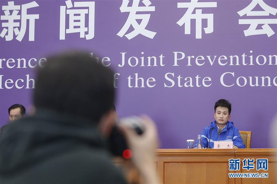 3月9日,中通快遞北京廠洼路網(wǎng)點(diǎn)快遞員李杰在北京出席國(guó)務(wù)院聯(lián)防聯(lián)控機(jī)制新聞發(fā)布會(huì)。新華社記者張玉薇攝