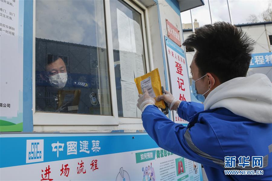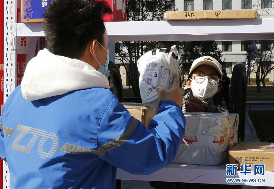 3月12日,李杰(左一)在中國(guó)青年政治學(xué)院快遞點(diǎn)隔著柵欄給客戶遞送包裹。新華社記者張玉薇攝