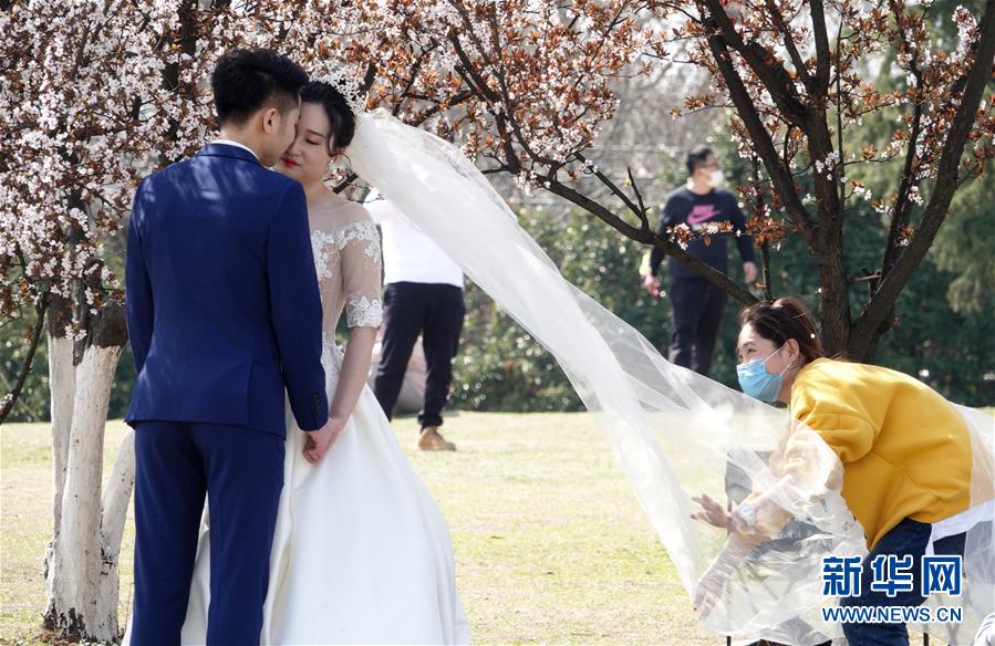 3月15日,在南京東郊體育公園,一名攝影助理給一對拍攝婚紗照的新人整理婚紗。 當(dāng)日,南京風(fēng)和日麗,市民們來到東郊體育公園,踏青春游。 新華社記者 楊磊 攝