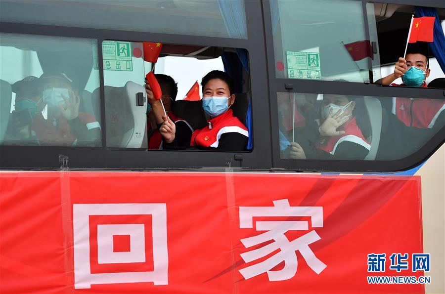 3月17日,抵達陜西西安的醫(yī)療隊隊員向前來迎接的人員揮手致意。新華社記者李一博攝