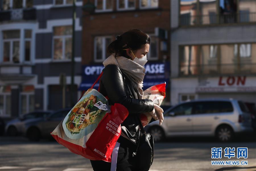 3月18日,在比利時布魯塞爾,一名女子購物后走在街道上。 新華社記者 鄭煥松 攝
