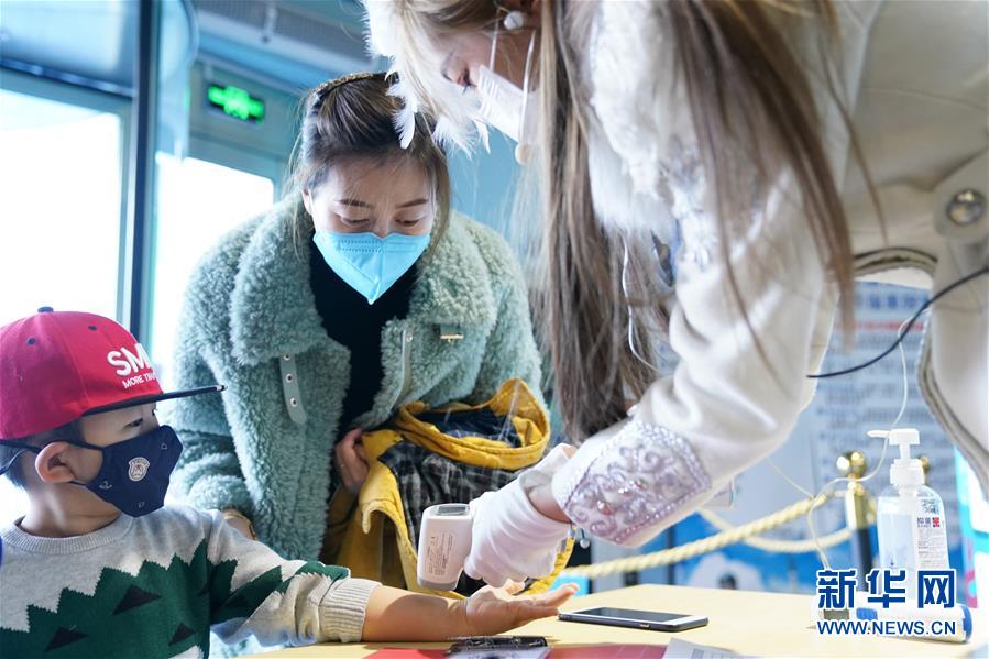 3月23日,在哈爾濱極地館入口,工作人員在給游客測量體溫。當(dāng)日,哈爾濱極地館恢復(fù)營業(yè)。目前,極地館日接待人數(shù)不超過400人,園區(qū)采取分時段、間隔性辦法安排游客有序入園。游客實名預(yù)訂門票,入園要配合測溫、佩戴口罩、掃描“龍江健康碼”,刷身份證入館。新華社記者王建威攝