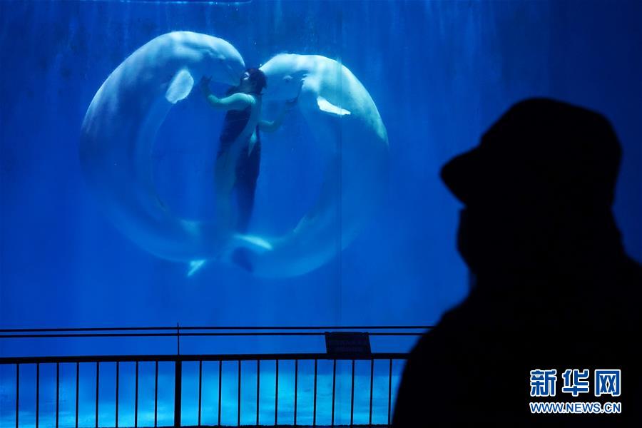 3月23日,游客在哈爾濱極地館觀賞白鯨表演。當(dāng)日,哈爾濱極地館恢復(fù)營(yíng)業(yè)。目前,極地館日接待人數(shù)不超過(guò)400人,園區(qū)采取分時(shí)段、間隔性辦法安排游客有序入園。游客實(shí)名預(yù)訂門(mén)票,入園要配合測(cè)溫、佩戴口罩、掃描“龍江健康碼”,刷身份證入館。新華社記者王建威攝