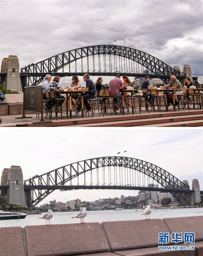 拼版照片顯示:(上)3月10日,人們?cè)诎拇罄麃喯つ岷8鄞髽蚋浇貌汀?(下)3月24日,澳大利亞悉尼海港大橋附近空無一人。 新華社記者 白雪飛 攝
