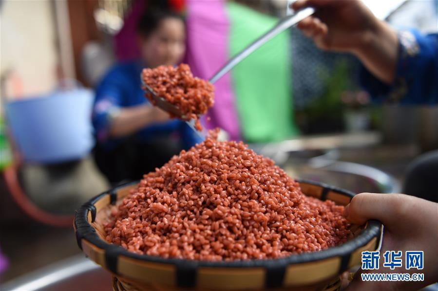 3月25日,在廣西上林縣巷賢鎮(zhèn),一名壯族女子在查看糯米浸泡染色情況。新華社記者陸波岸攝
