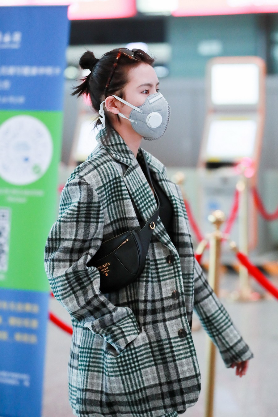 張予曦扎丸子頭穿格子西裝又美又颯 搭配斜挎小包潮范十足