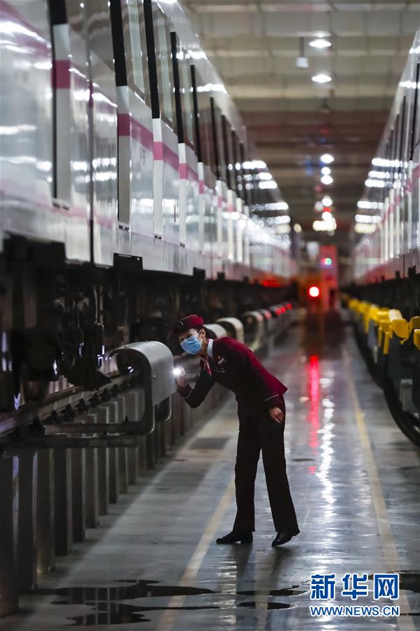 3月28日,武漢地鐵運營有限公司司機吳亞在常青車輛段檢查車輛情況。新華社記者沈伯韓攝
