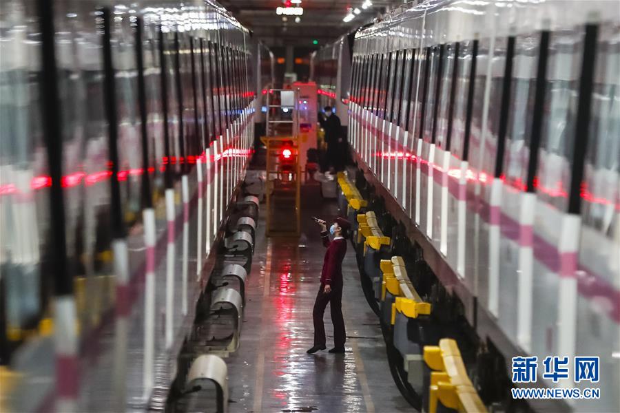 3月28日,武漢地鐵運營有限公司司機吳亞在常青車輛段檢查車輛情況。新華社記者沈伯韓攝