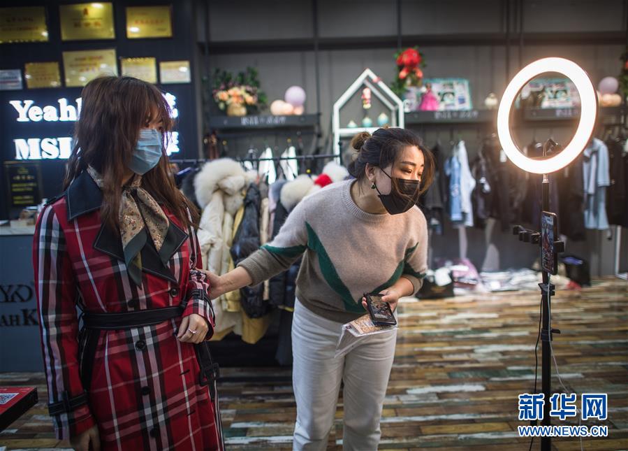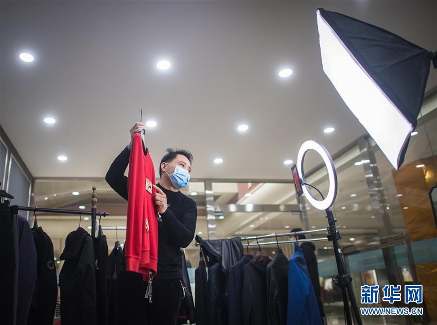 3月29日,在漢口北市場,一名主播在直播平臺直播銷售一款服裝。隨著疫情防控形勢好轉,武漢漢口北國際商品交易中心30多個市場全面開市運行。為助力商戶做好線上線下全面開市,市場積極引入50多家互聯(lián)網(wǎng)平臺、電商平臺及直播機構,服務市場商戶。新華社記者肖藝九攝
