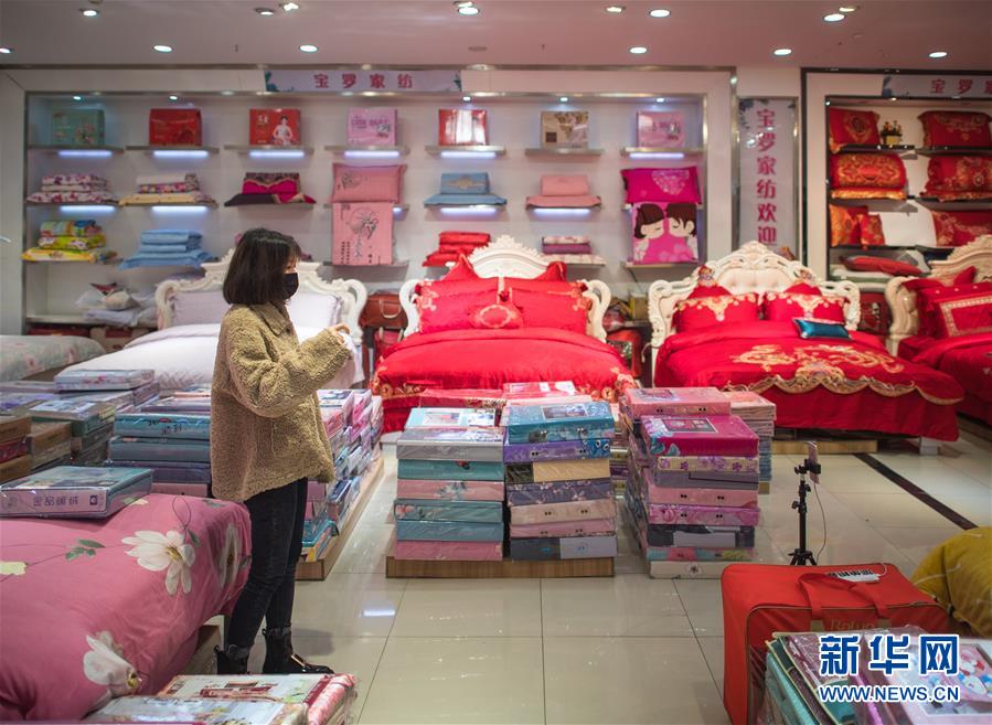 3月29日,在漢口北市場,一名主播在直播平臺直播銷售床上用品。新華社記者肖藝九攝