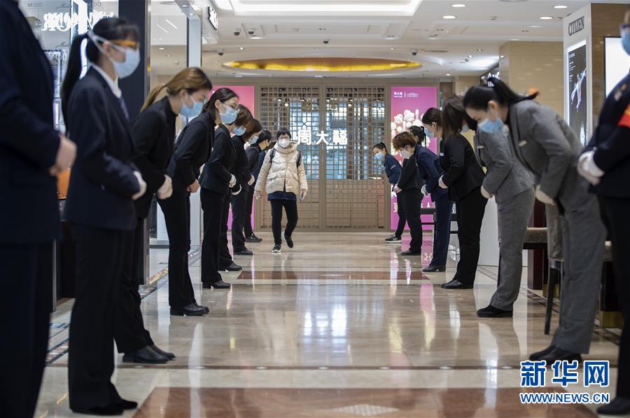 3月30日,在武商世貿(mào)廣場,工作人員歡迎顧客進入。當日,武漢市多家商場開門迎客。新華社記者費茂華攝