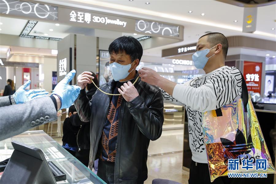 3月30日,在武漢市武商世貿(mào)廣場(chǎng),顧客(右二)在挑選飾品。當(dāng)日,武漢市多家商場(chǎng)開門迎客。新華社記者沈伯韓攝