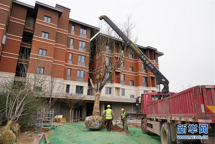 工人在雄安高質(zhì)量建設實驗區(qū)(生活)項目建設現(xiàn)場吊裝樹木(3月26日攝)。新華社記者楊世堯攝