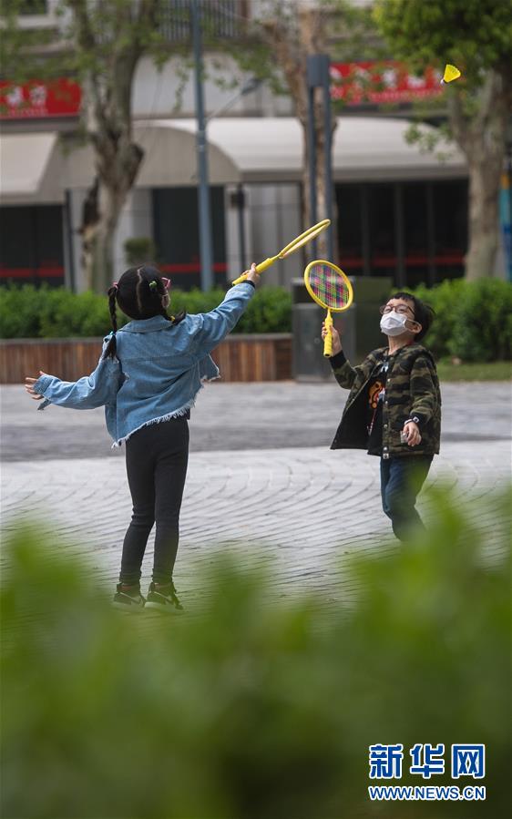 4月1日,小朋友在武漢天地廣場上打羽毛球。新華社記者肖藝九攝