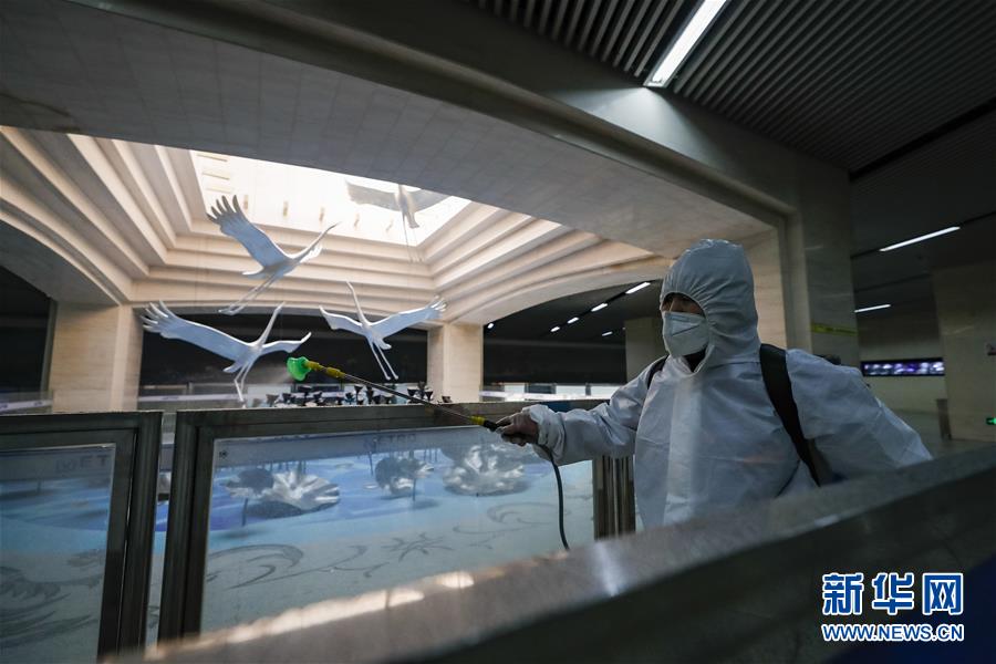 3月23日,在漢口火車站地鐵站,保潔人員在為站廳乘客通道消毒。目前,武漢城市功能和市民生活正逐步有序恢復(fù),地鐵、公交車系統(tǒng)已啟動全面消殺和張貼乘客健康二維碼識別等舉措,為恢復(fù)運(yùn)營做準(zhǔn)備。新華社記者沈伯韓攝