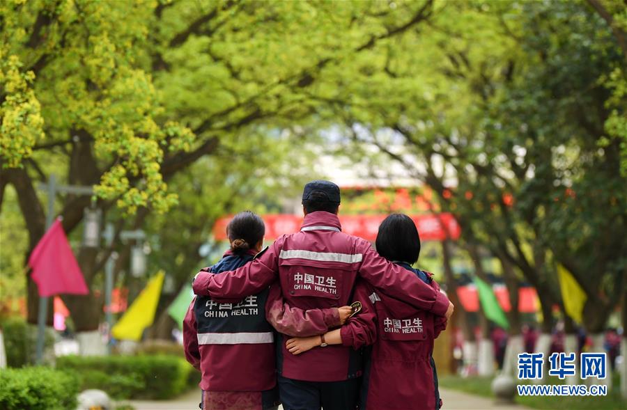 4月3日,陜西省第一批援鄂醫(yī)療隊(duì)隊(duì)長易智(中)安慰離別的隊(duì)員。 當(dāng)日,陜西省第一批援鄂醫(yī)療隊(duì)137名隊(duì)員在陜西省工人療養(yǎng)院結(jié)束了為期兩周的隔離休養(yǎng)。醫(yī)療隊(duì)員與“戰(zhàn)友”深情作別后,陸續(xù)踏上歸途。 新華社記者 李一博 攝