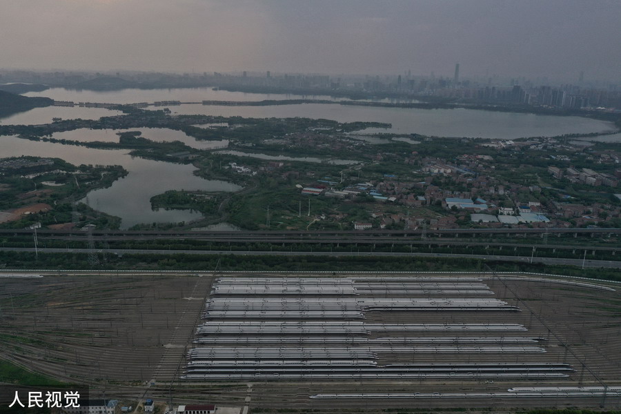 2020年4月6日,武漢動(dòng)車段高鐵動(dòng)車組整裝待發(fā)(無(wú)人機(jī)照片)。