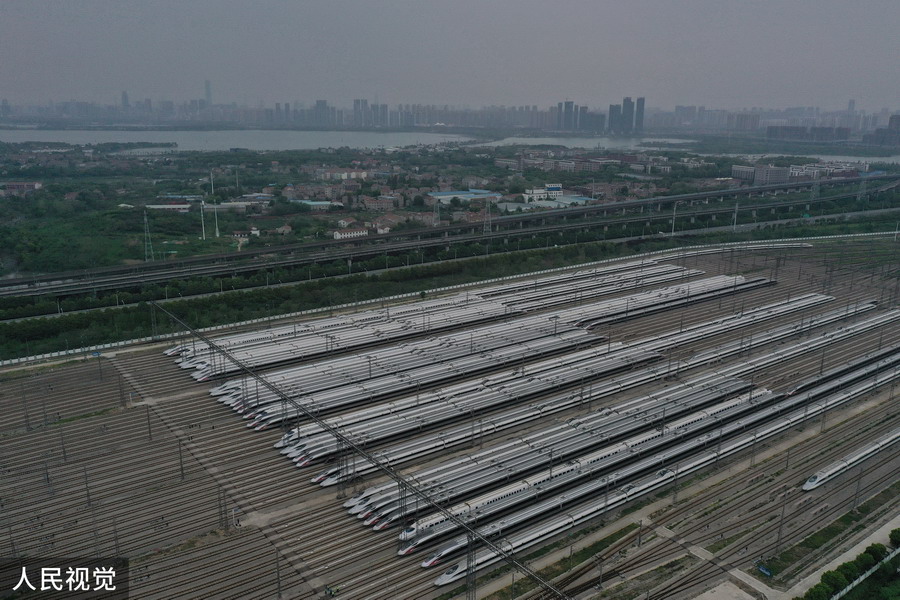 2020年4月6日,武漢動(dòng)車(chē)段高鐵動(dòng)車(chē)組整裝待發(fā)(無(wú)人機(jī)照片)。