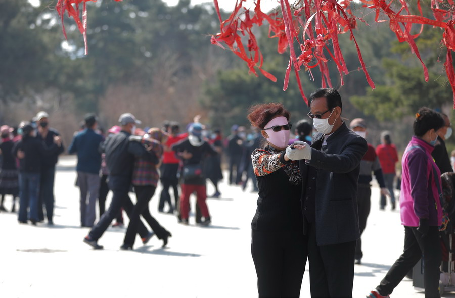 2020年4月6日,遼寧沈陽,北陵公園在清明小長假的最后一天,游客猛增。市民對各項(xiàng)游戲都踴躍參與。圖為伴著歡快優(yōu)美的樂曲,大爺大媽們紛紛起舞。